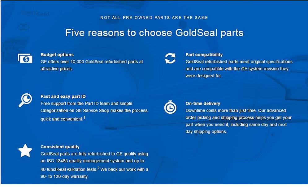 GoldSeal parts are GE refurbished parts that have been validated through a GE Healthcare certified process using an ISO 13485 quality system. Every GoldSeal part goes through an extensive validation process to meet our quality standards. They offer an attractive alternative for your budget constraints while delivering the quality and reliability you’ve come to expect from GE Healthcare. For confidence and peace of mind, GoldSeal parts come with a full 90- to-120-day warranty.